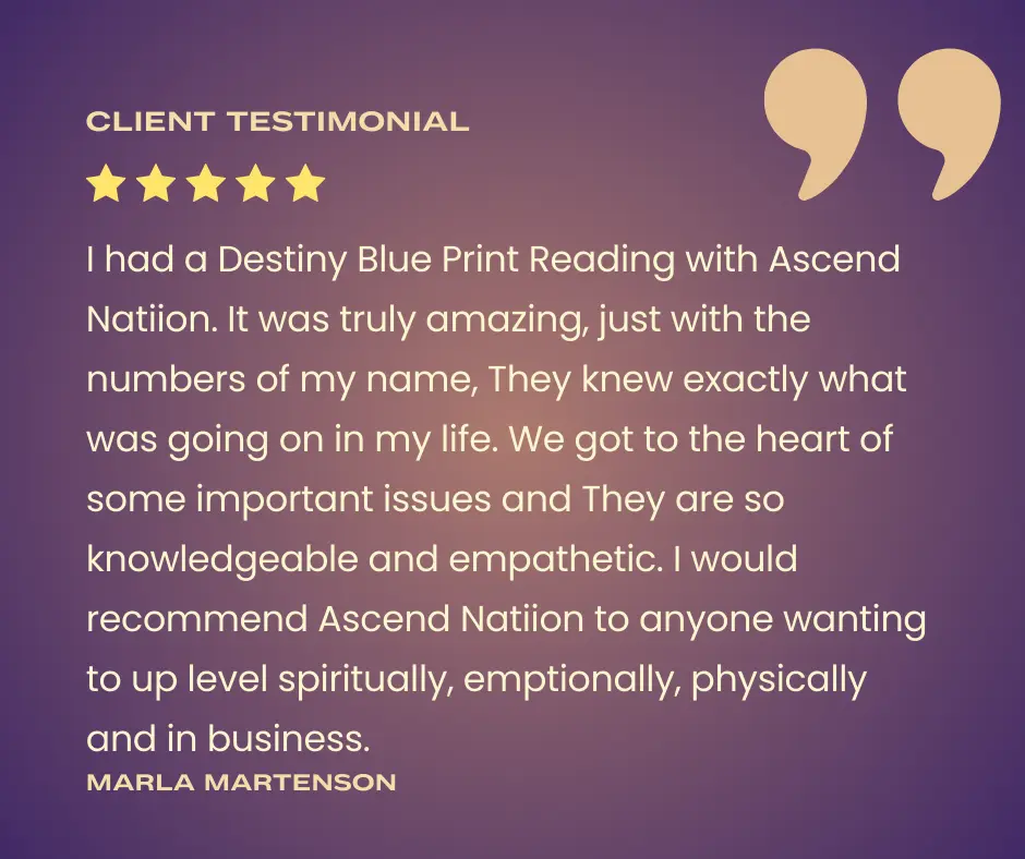 I did Ascend Natiion’s destiny blue print and It was truly amazing, just with the numbers of my name, They knew exactly what was going on in my life. We got to the heart of some important issues and she is so knowledgeable and empathetic. I would recommend Ascend Natiion’s destiny blue print to anyone wanting to up level spiritually, emptionally, physically and in business.