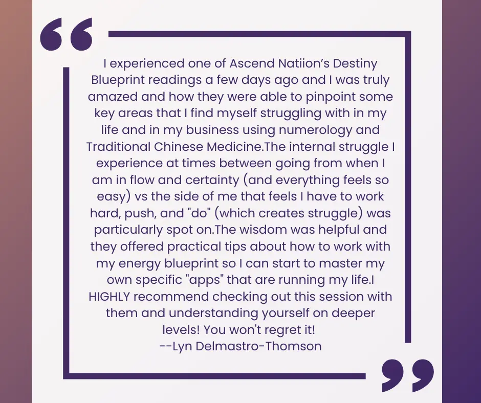 I experienced Ascend Natiion’s Destiny Blueprint reading a few days ago and I was truly amazed and how they were able to pinpoint some key areas that I find myself struggling with in my life and in my business using numerology and Traditional Chinese Medicine.The internal struggle I experience at times between going from when I am in flow and certainty (and everything feels so easy) vs the side of me that feels I have to work hard, push and “do” (which creates struggle) was particularly spot on.The wisdom was helpful and they offered practical tips about how to work with my energy blueprint so I can start to master my own specific “apps” that are running my life. I HIGHLY recommend checking out this session with them and understanding yourself on deeper levels! You won’t regret it!
